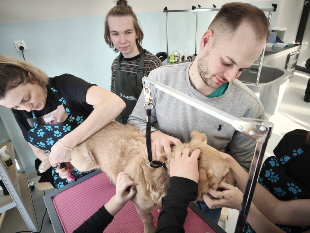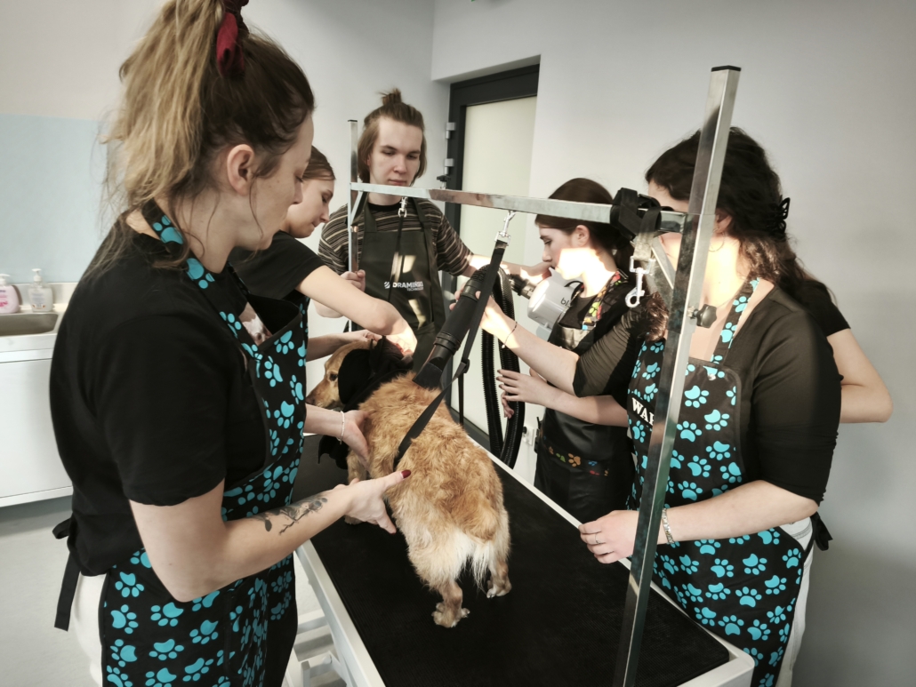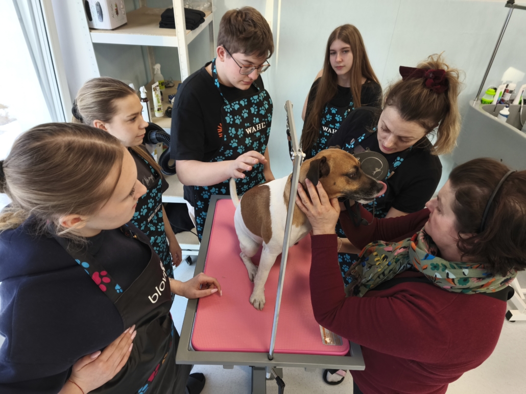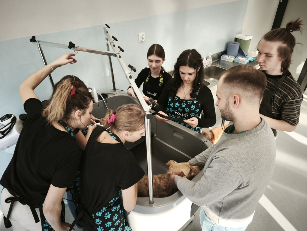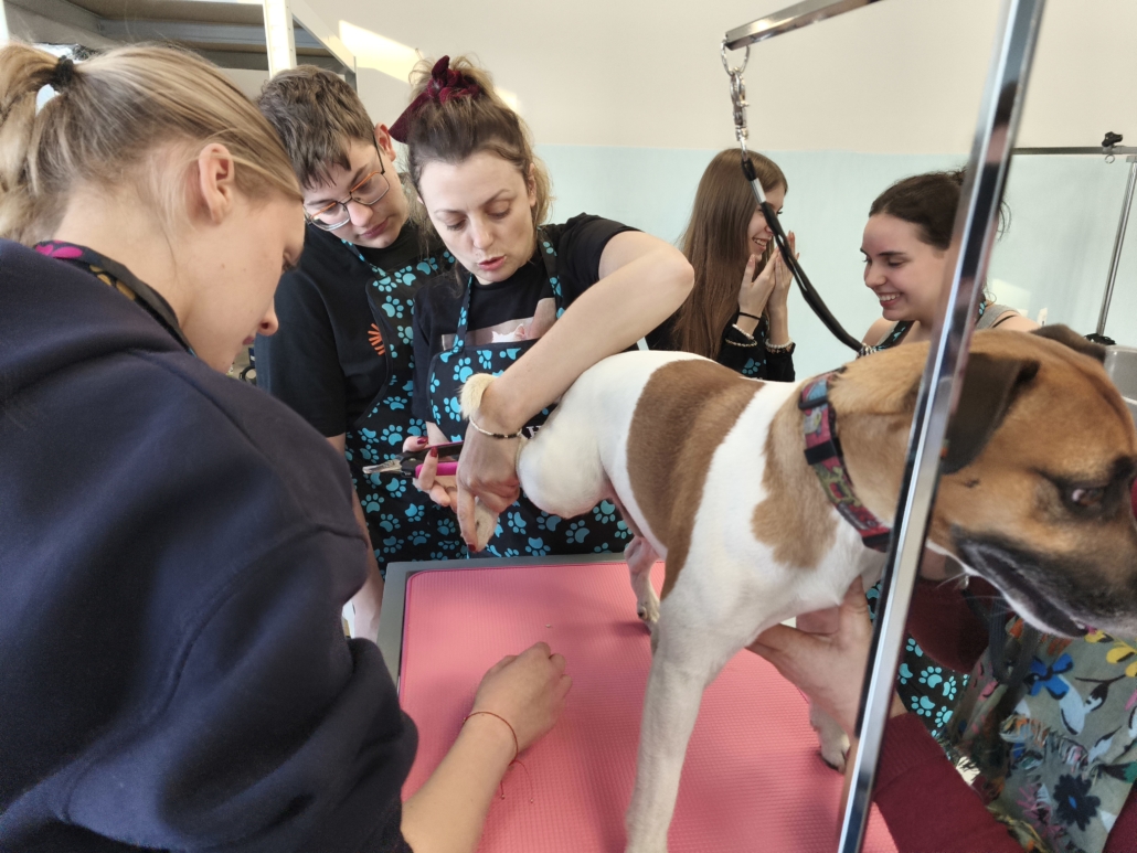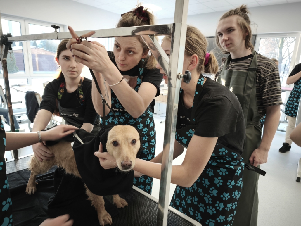 Najważniejszą częścią szkolenia były zajęcia praktyczne, podczas których uczestnicy pracowali na rzeczywistych zwierzętach. W trakcie trzech dni szkoleniowych wykonano zabiegi pielęgnacyjne i strzyżenia na kilkudziesięciu psach oraz kilku kotach, co pozwoliło młodym uczestnikom zdobyć realne doświadczenie i pewność w wykonywaniu podstawowych czynności groomerskich. Każde zwierzę było inne, co dodatkowo uczyło elastyczności, uważnej obserwacji oraz indywidualnego podejścia.