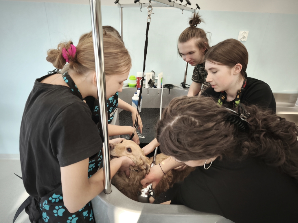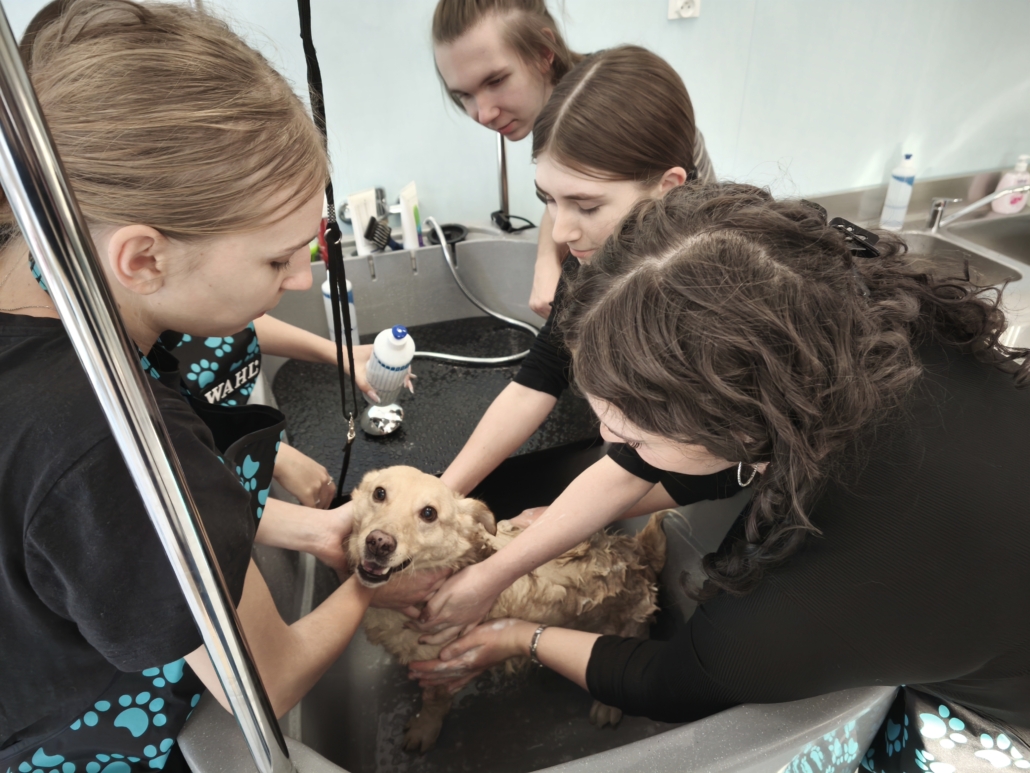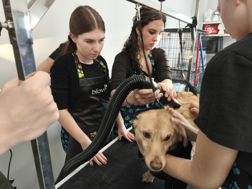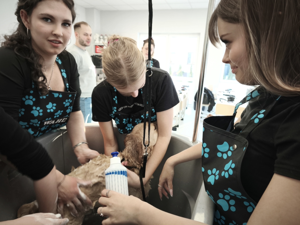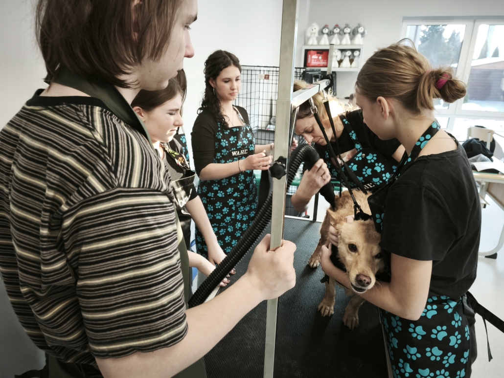 Najważniejszą częścią szkolenia były zajęcia praktyczne, podczas których uczestnicy pracowali na rzeczywistych zwierzętach. W trakcie trzech dni szkoleniowych wykonano zabiegi pielęgnacyjne i strzyżenia na kilkudziesięciu psach oraz kilku kotach, co pozwoliło młodym uczestnikom zdobyć realne doświadczenie i pewność w wykonywaniu podstawowych czynności groomerskich. Każde zwierzę było inne, co dodatkowo uczyło elastyczności, uważnej obserwacji oraz indywidualnego podejścia.