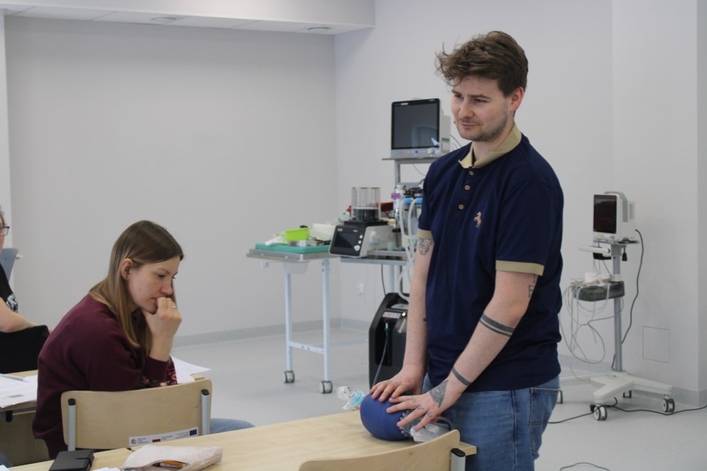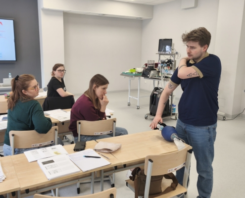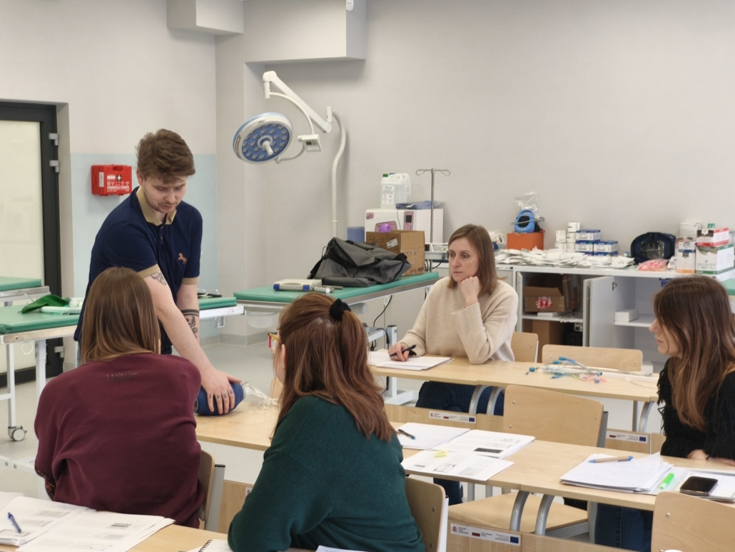 Zajęcia praktyczne realizowano etapowo: od organizacji stanowiska, poprzez zabezpieczenie dróg oddechowych i prowadzenie monitoringu, aż po procedury końcowego wybudzania. Omówiono także najczęściej spotykane powikłania i sposoby reagowania na sytuacje wymagające szybkiej interwencji. Wszystkie elementy ćwiczono krok po kroku, z natychmiastową możliwością omówienia techniki i wprowadzenia korekt.