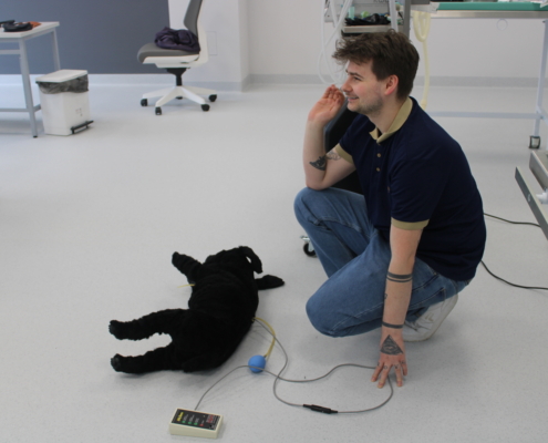 Integralną częścią szkolenia była sesja pokazowa z udziałem żywych zwierząt, przyprowadzonych przez jedną z uczestniczek. Pokaz miał charakter edukacyjny i nie obejmował procedur inwazyjnych — skupiono się na praktycznym rozmieszczeniu czujników, właściwej ergonomii pracy i analizie parametrów u realnego pacjenta.