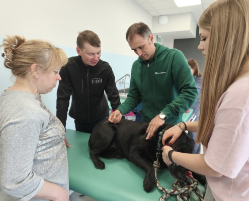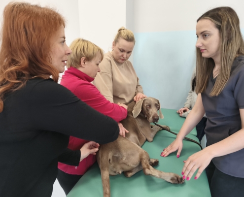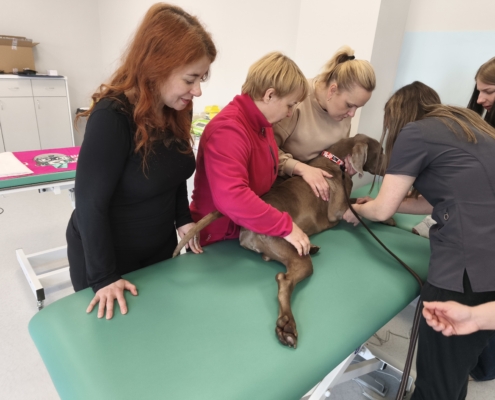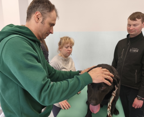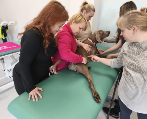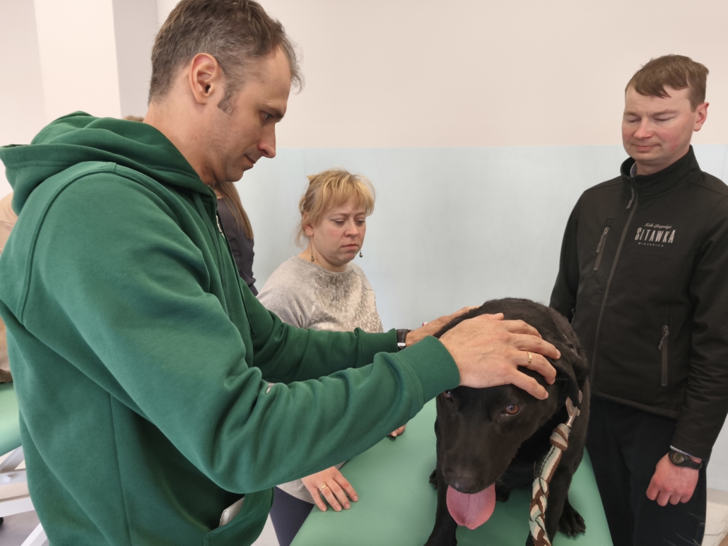 Dużą część szkolenia poświęcono również kinezyterapii — jednej z najważniejszych metod fizjoterapeutycznych. Uczestnicy brali udział w licznych blokach praktycznych, ucząc się ćwiczeń poprawiających mobilność, stabilizację i funkcję ruchową zwierząt. Intensywność zajęć sprawiła, że każdy mógł nabrać pewności w pracy manualnej i ruchowej.